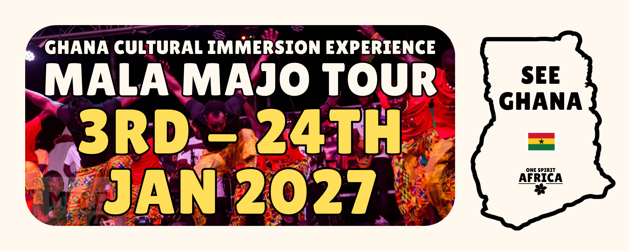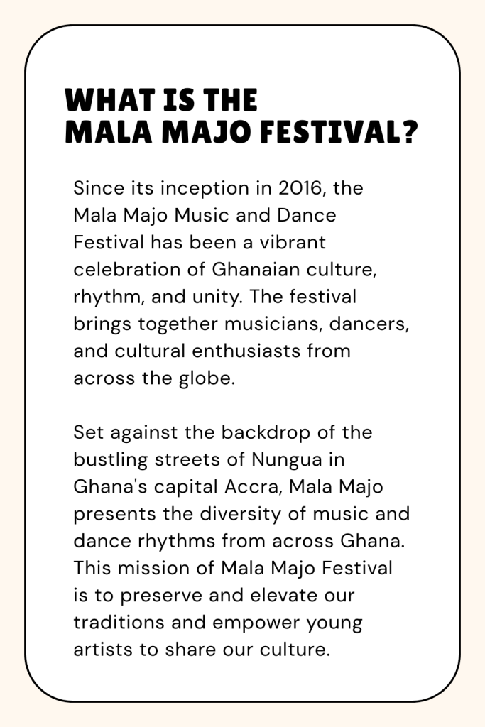 Since its inception in 2016, the Mala Majo Music and Dance Festival has been a vibrant celebration of Ghanaian culture, rhythm, and unity. Founded by Fred Nii Addo of One Spirit Africa, the festival brings together musicians, dancers, and cultural enthusiasts from across the globe to experience the rich traditions of Ghanaian music and dance. Set against the backdrop of the bustling streets of Nungua in Ghana’s capital Accra, Mala Majo offers performances by local artists that demonstrate the diversity of music and dance rhythms from across Ghana.