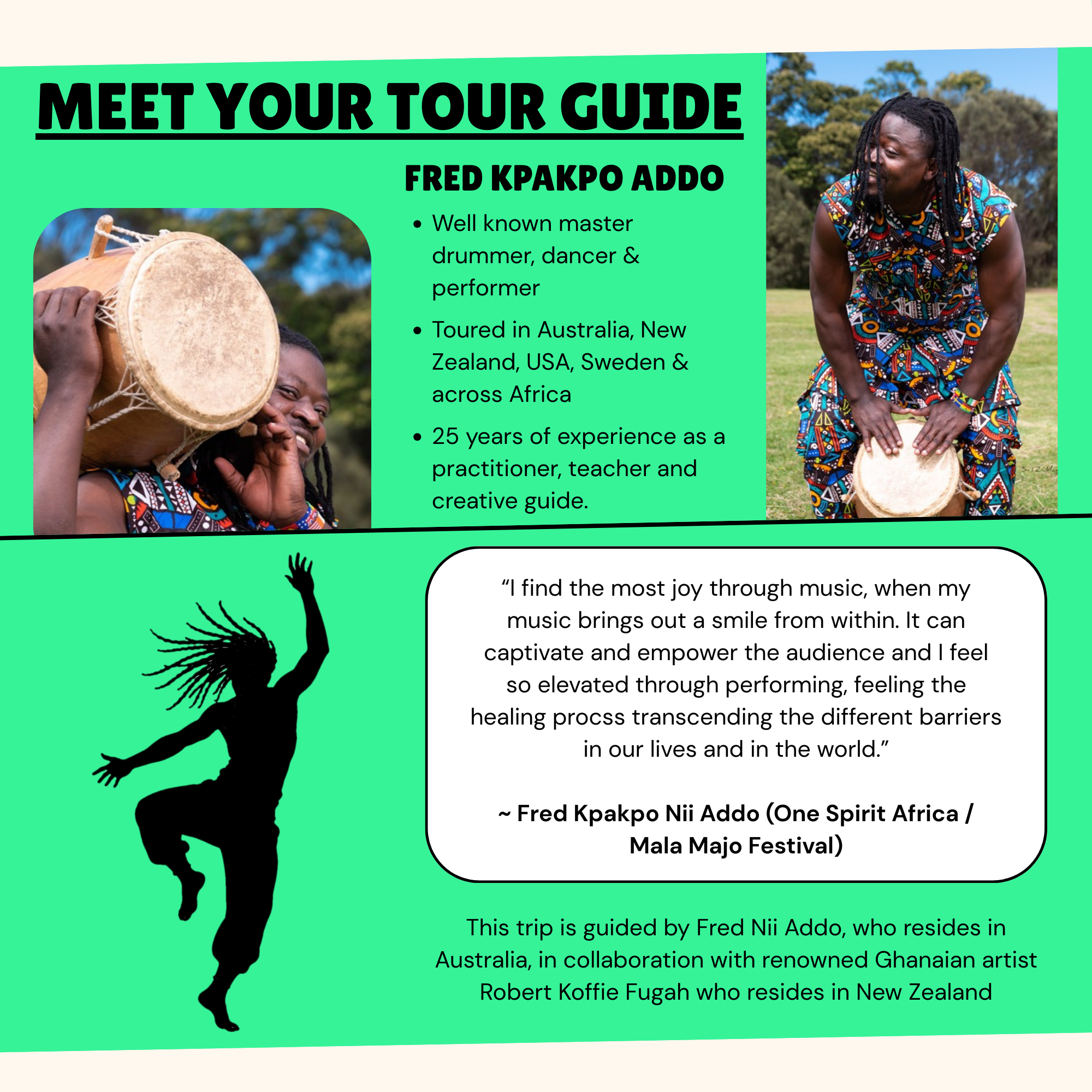 “I feel the community has done a lot for me, supporting and encouraging my career when growing up as a traditional drum and dance artist and a musician. I started this festival to create hope and to keep hope alive for the young and talented traditional artists in my community, Nungua Accra – Ghana.” ~ Fred Nii Addo