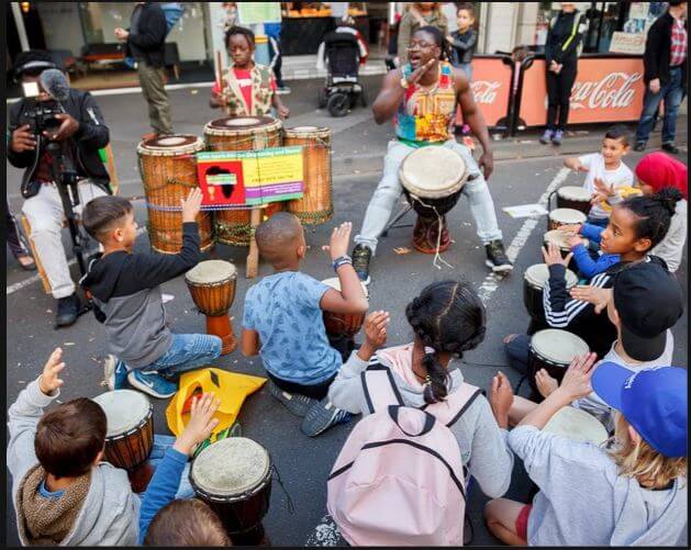 We provide each participant with traditional African percussion instruments such as drums, shakers and bells