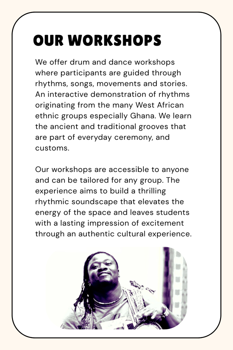 No matter what the experience level in African drum and dance, Fred is amazing at making his workshops engaging and inclusive.